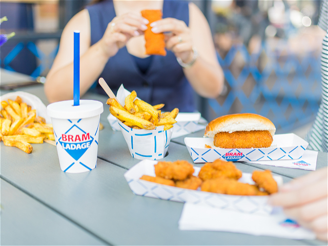 Nieuw! Proef de krokante kipfiletburger met sla, Bram's huisgemaakte pindasaus en gebakken uitjes.